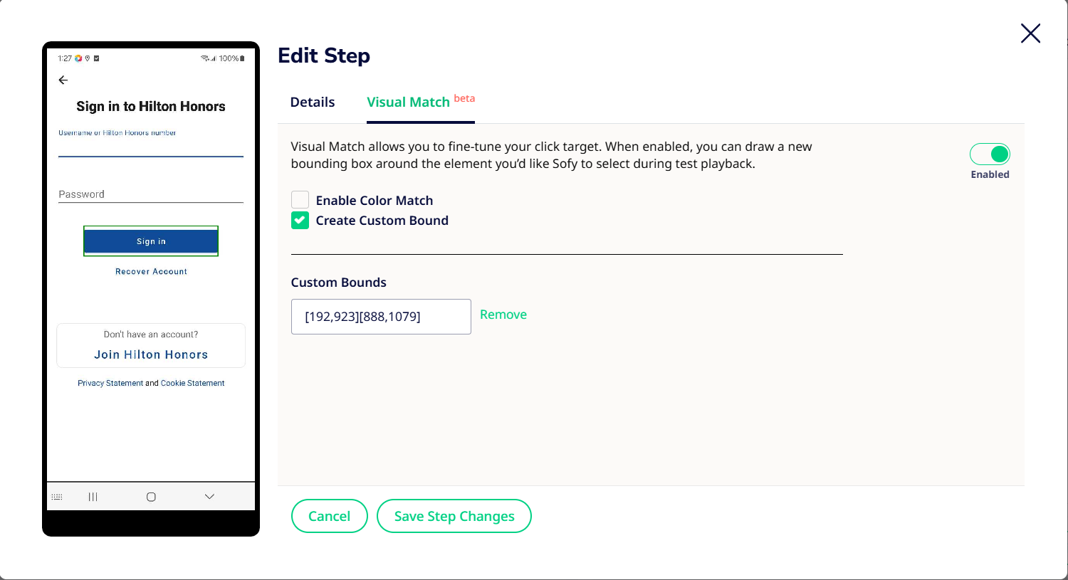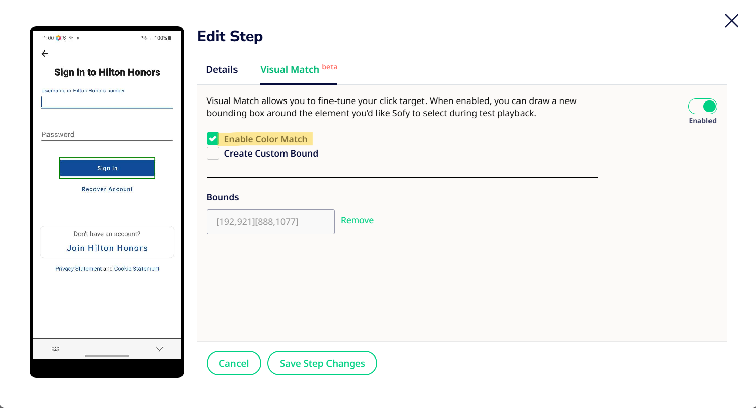 Visual Match allows you to override and fine-tune your click target in automated test steps. When enabled, you can draw a new bounding box around the element you’d like Sofy to select during test playback.