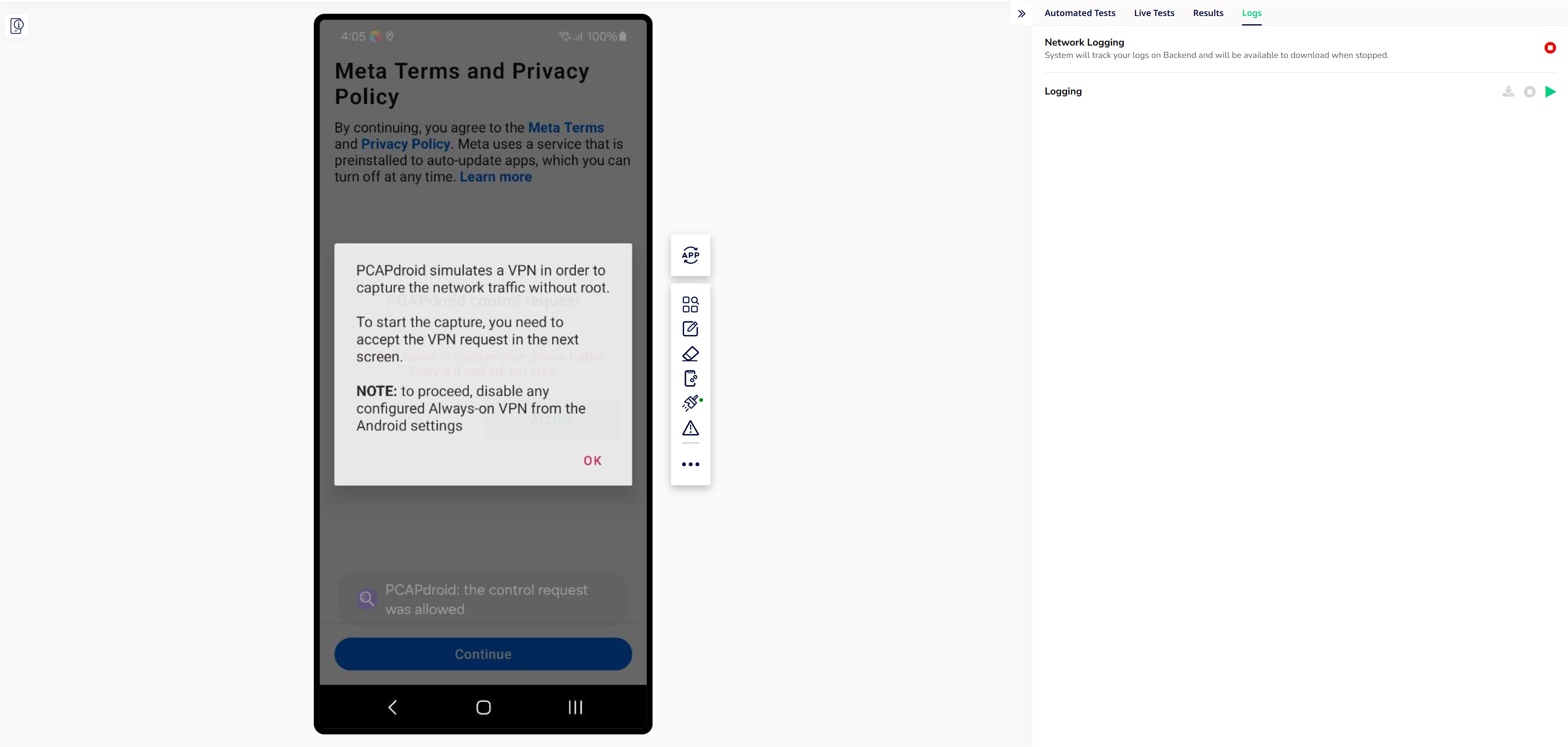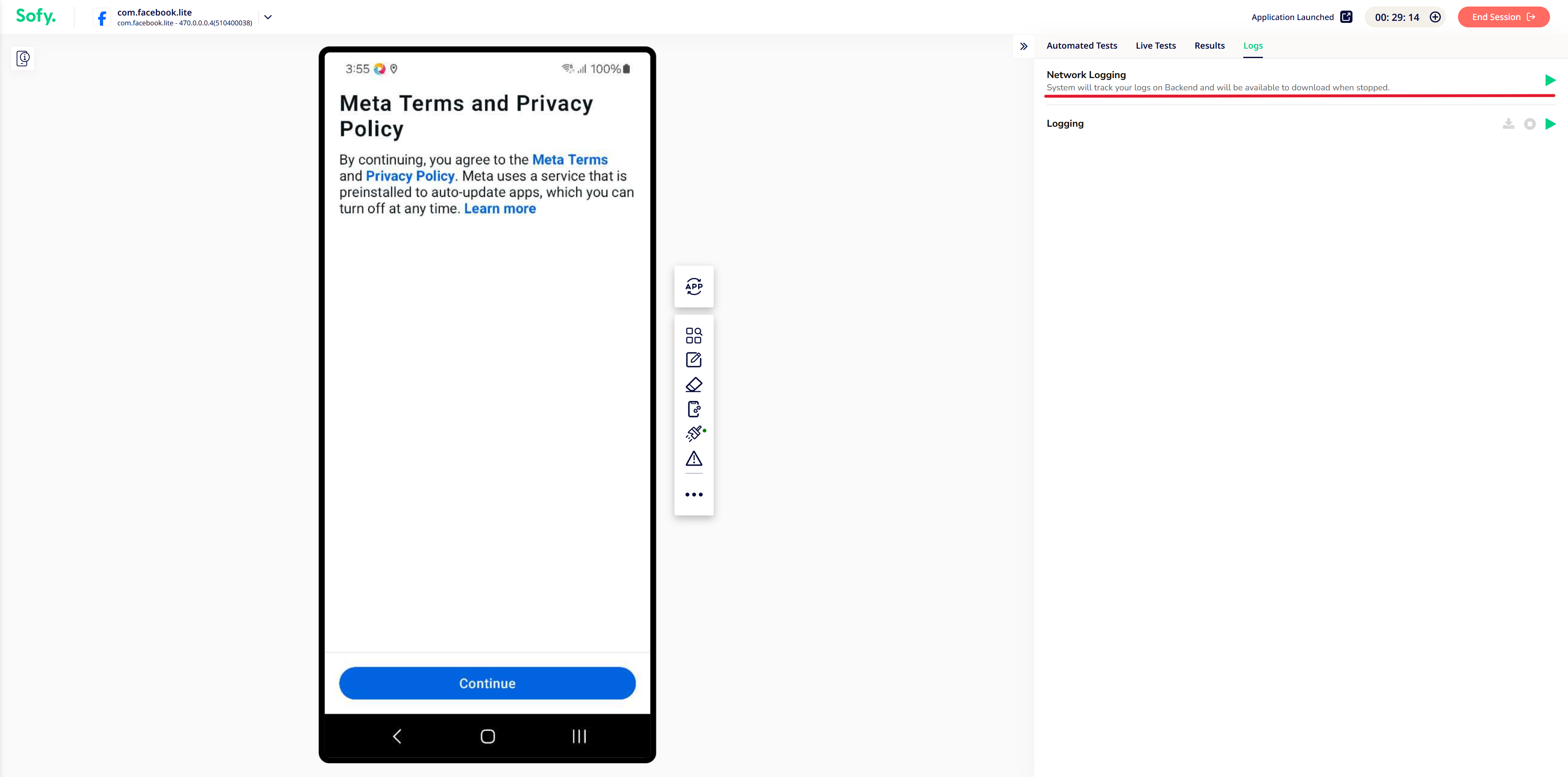 - All system prompts regarding allowing the network logging to begin on the device will be auto-handled by Sofy.