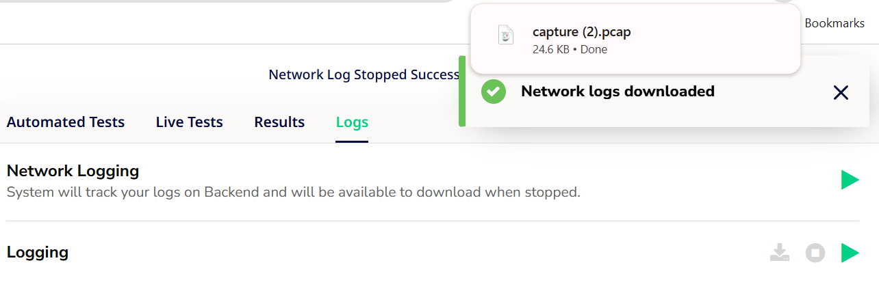 - If you choose Download Logs, the captured file will become available for download in PCAP format (.pcap).