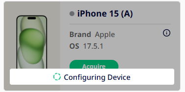 - Configuring: Device is undergoing processes to become available for use shortly. It is denoted by a green spinner and a "Configuring Device" banner. Once the configuration process has completed, the device will once again appear as 'Available'.