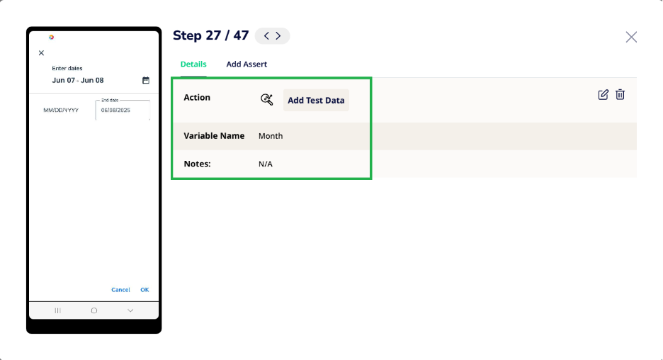 If you’re using a Testing Data Variable, define the day, month, and year as separate variables when the field expects segmented input. Then insert each part sequentially during a Lab Session or while editing the test offline.