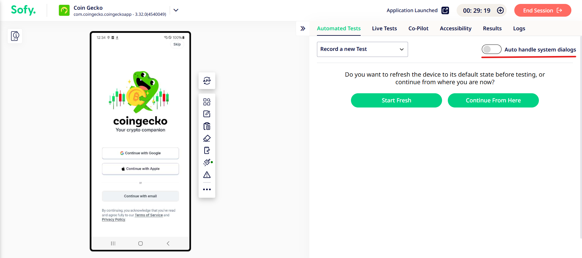 In order to fix it, Sofy gives you an option to automatically handle all dialog pop-ups. To ensure that no unexpected dialog pop-ups interrupt your testing sequence, before you start recording a test, make sure that the "Auto-handle system dialogs" option is enabled inside the Recording tab: